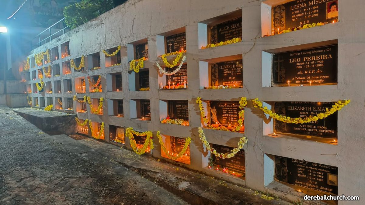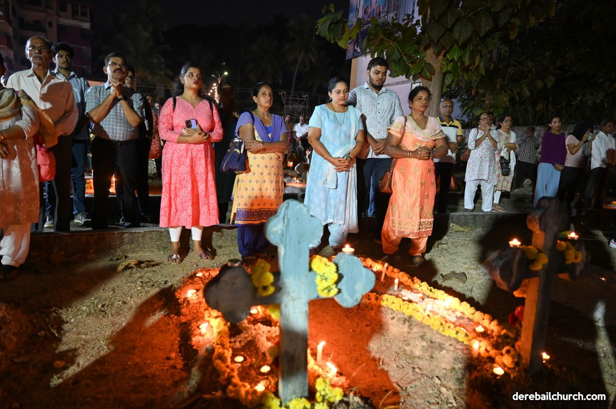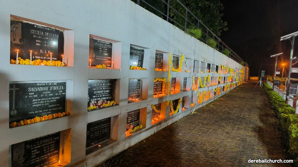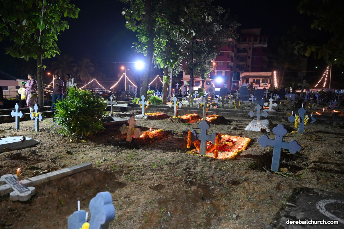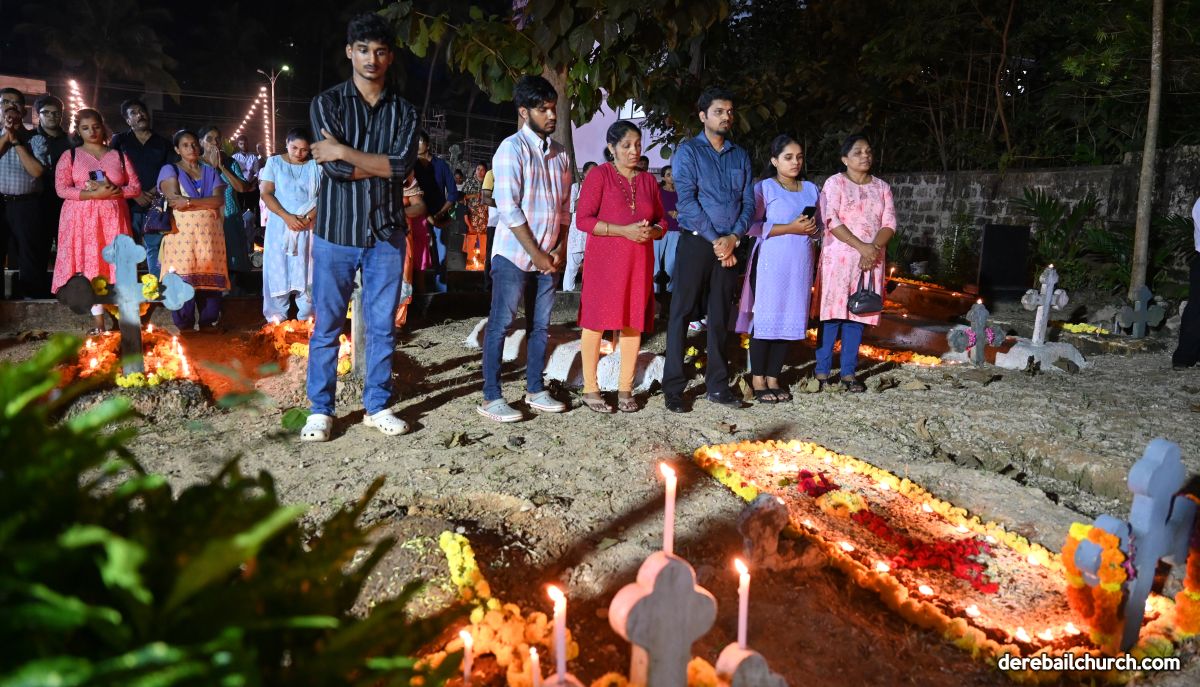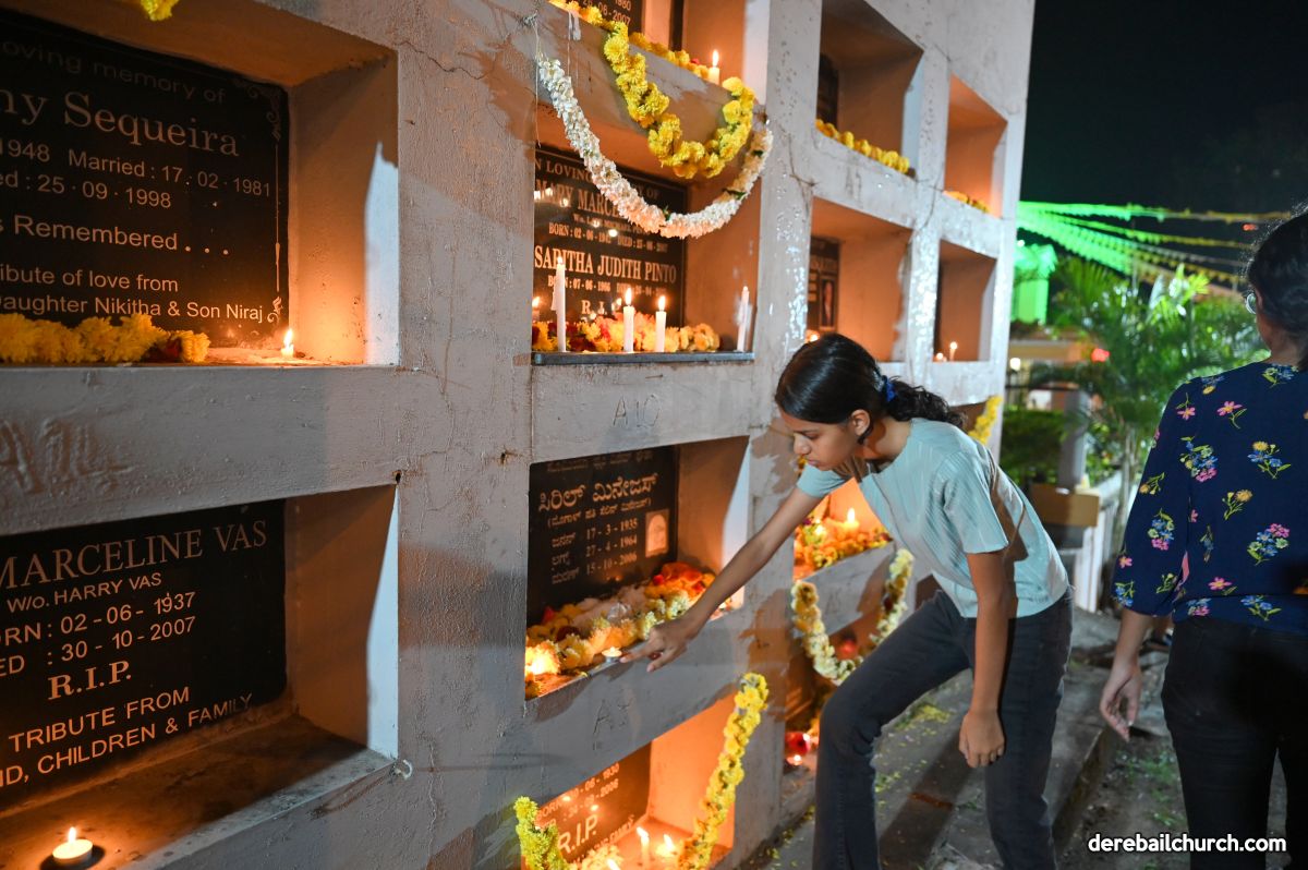 The solemn masses for All Saints Day on 1st November were held at 6.15 am and 5.30 pm at Most Holy Redeemer Church Derebail. On the same day, after the 5.30 pm mass a short prayer was held at the Church Cemetery on the account of All Souls Day. Following the prayer, the Parish Priest Rev. Fr. Joseph Martis and the Associate Parish Priest Rev. Fr. Kevin Dsouza sprinkled Holy Water on all the graves in the cemetery. Parishioners stood beside the tombstones of their dearly departed family members and took part in the prayer. Despite the dark, the Church Cemetery illuminated with the candles and flowers that were placed on the graves of the parishioners. As All Souls Day is observed on 2nd November, masses were also held at 6.15 and 7.15 am. While All Souls Day acts as a yearly ritual to commemorate their loved ones, it also enables Catholics to reaffirm their faith in Christ.