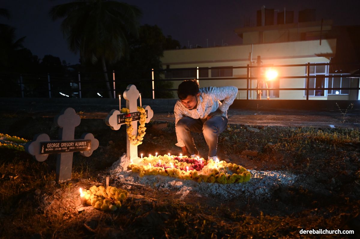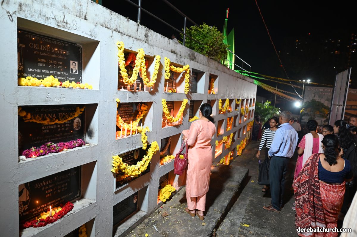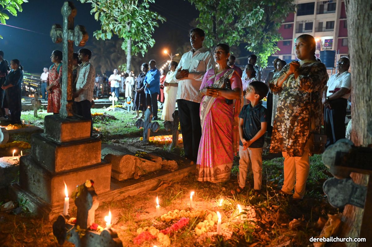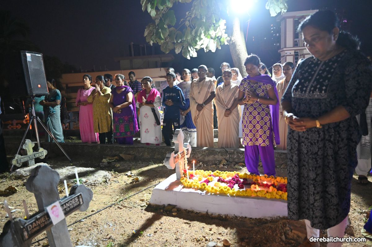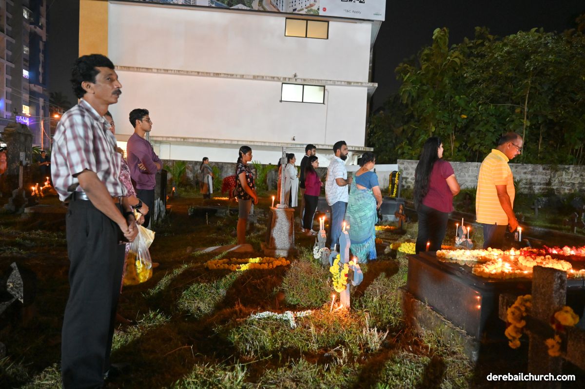 The solemn masses for All Saints Day on 1st November were held at 6.15 am and 5.30 pm at Most Holy Redeemer Church Derebail. On the same day, after the 5.30 pm mass a short prayer was held at the Church Cemetery on the account of All Souls Day. Following the prayer, the Parish Priest Rev. Fr. Joseph Martis and the Associate Parish Priest Rev. Fr. Kevin Dsouza sprinkled Holy Water on all the graves in the cemetery. Parishioners stood beside the tombstones of their dearly departed family members and took part in the prayer. Despite the dark, the Church Cemetery illuminated with the candles and flowers that were placed on the graves of the parishioners. As All Souls Day is observed on 2nd November, masses were also held at 6.15 and 7.15 am. While All Souls Day acts as a yearly ritual to commemorate their loved ones, it also enables Catholics to reaffirm their faith in Christ.