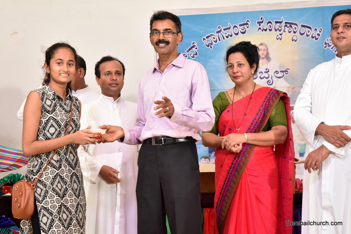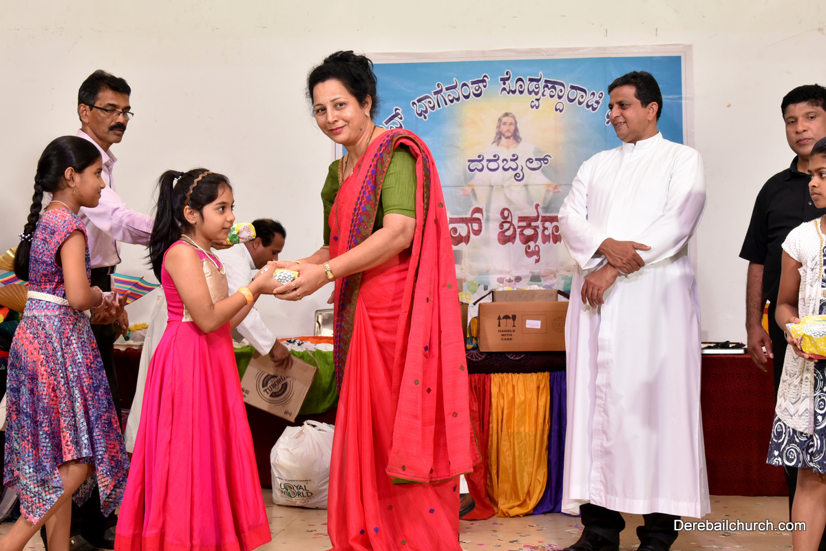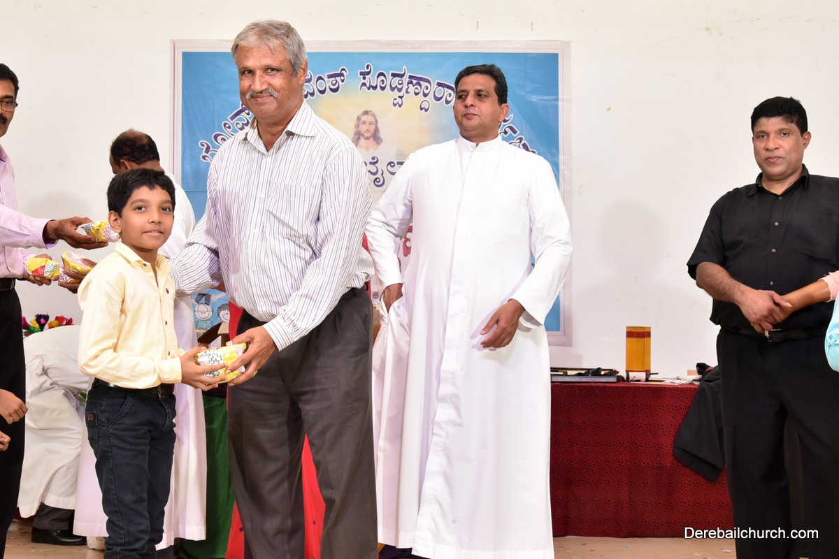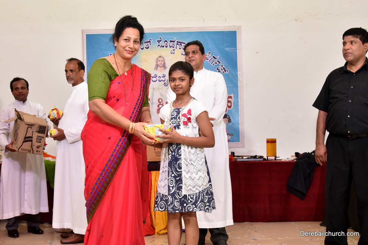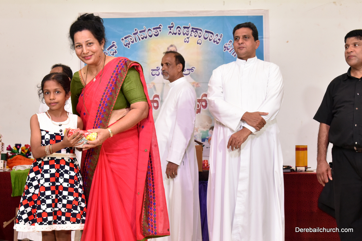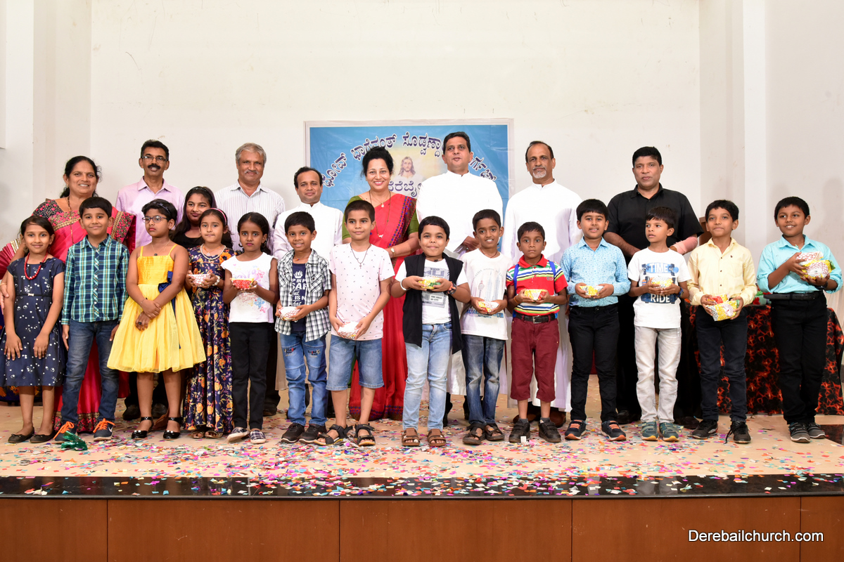 The cultural programme was organised in the Parish Hall at 3.30 PM. The programme began with a prayer song sung by the catechism teachers. Fr.Gratian welcomed the gathering. A Bible magic show was presented by Fr Ivan Madtha and his sister Sr. Doris. Amisha Rodrigues, Christon Menezes from Ycs and Brayan Mendonca of 10th Std shared their experience of Sunday catechism. Mrs Sharmila Mascarenhas on behalf of the teachers shared the beautiful experience of teaching Sunday Catechism to the Children. Fr Austin addressed the gathering and appreciated the parents and children for their whole hearted cooperation in the mission of Sunday catechism.  The dignitaries present on the Dias were Fr Austin Peres Parish Priest, Fr Gratian Alvares Residential Priest, Fr Gerald Pinto Residential Priest, Mrs Sheela D'Souza the Vice president of Parish Pastoral Council,  Mr Gaulbert Pais the Secretary of Parish Pastoral Council, Fr Ivan Madtha and Mr. Edward Coelho Catechism Coordinator. The prizes were distributed to the children for excelling in catechism exam, full attendance and for workbook.As a part of encouraging the little children to sacrifice and make their contribution to misson Sunday a collection box was allotted to every child. These boxes were returned with the offerings of the little children. Special prizes were given to the children who had collected the maximum amount. Catechism teachers were also felicitated for their selfless service on Sunday's for teaching students. Miss Anu D'Silva compered the programme and Mr Edward Coelho proposed the vote of thanks. The programme concluded with a hymn.