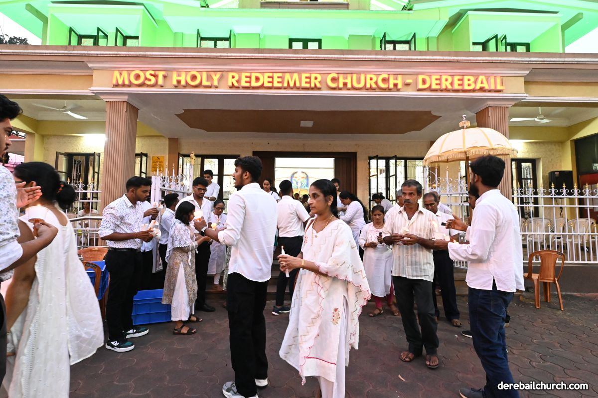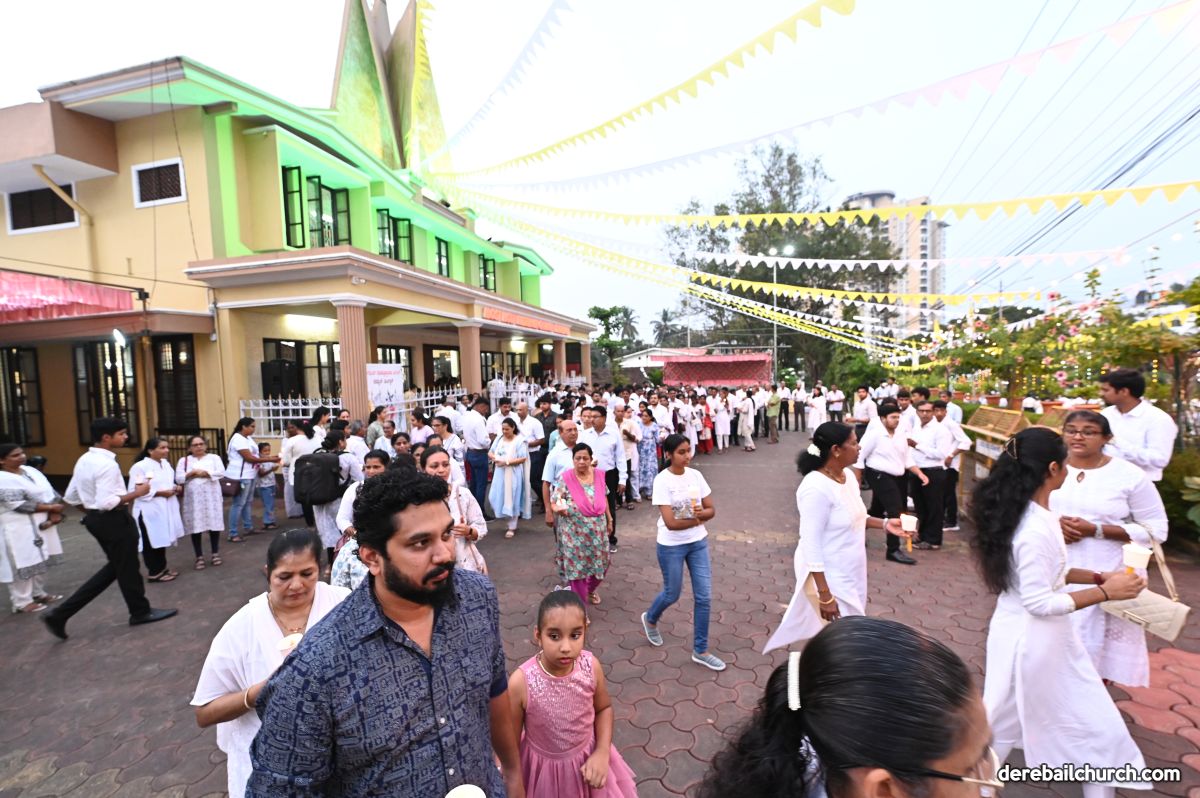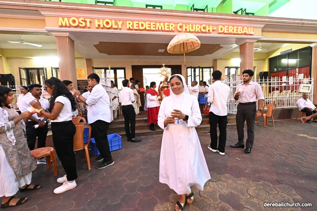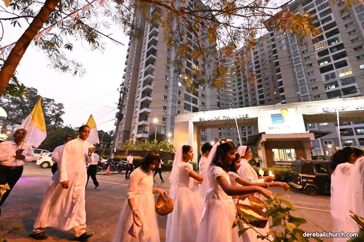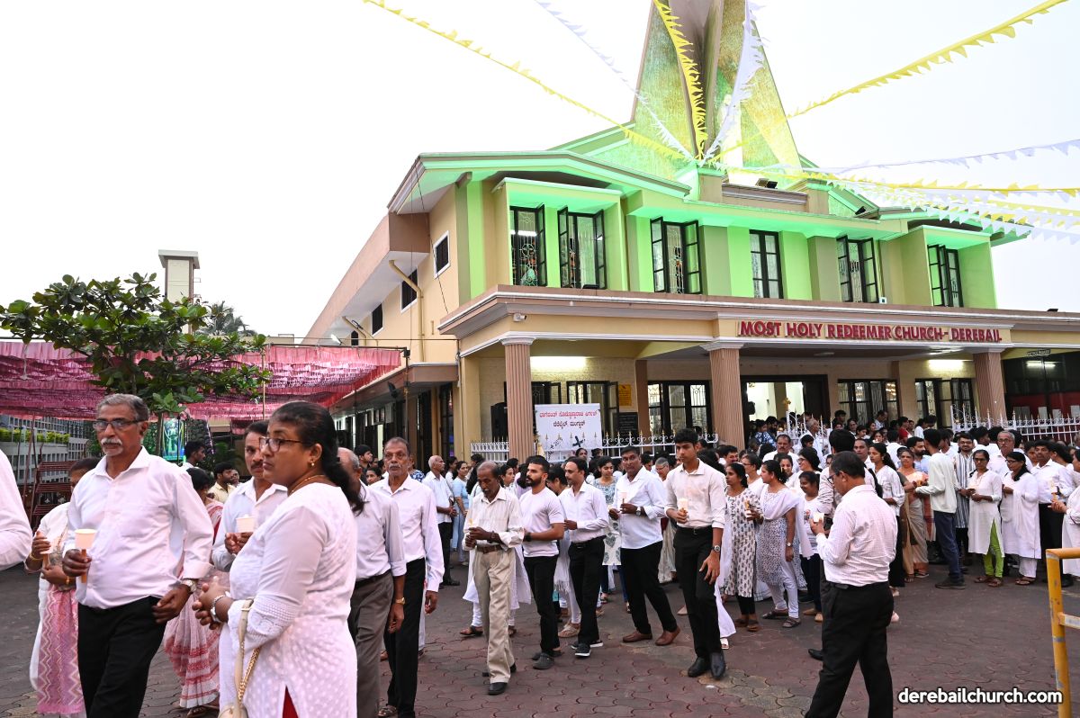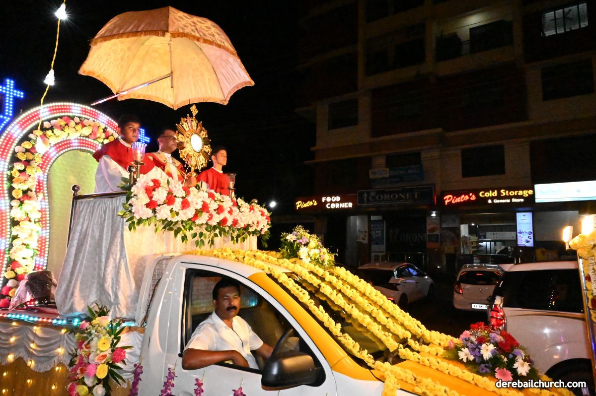 Following the Mass, a solemn procession began at the church entrance, proceeded towards Konchady Katte, and returned. Parishioners, dressed in white and off-white, participated with candles and hymns, symbolizing unity. The evening concluded with adoration of the Blessed Sacrament, accompanied by beautiful hymns by the church choir.