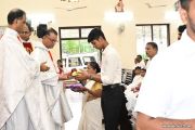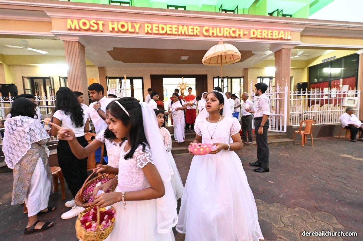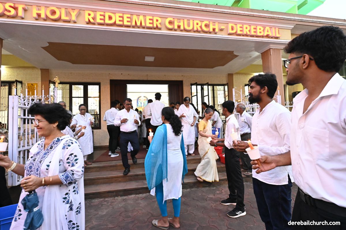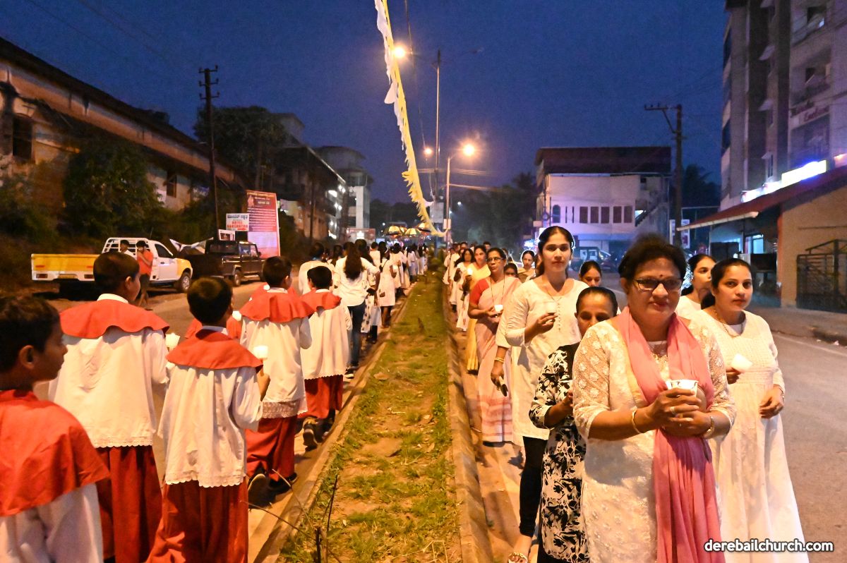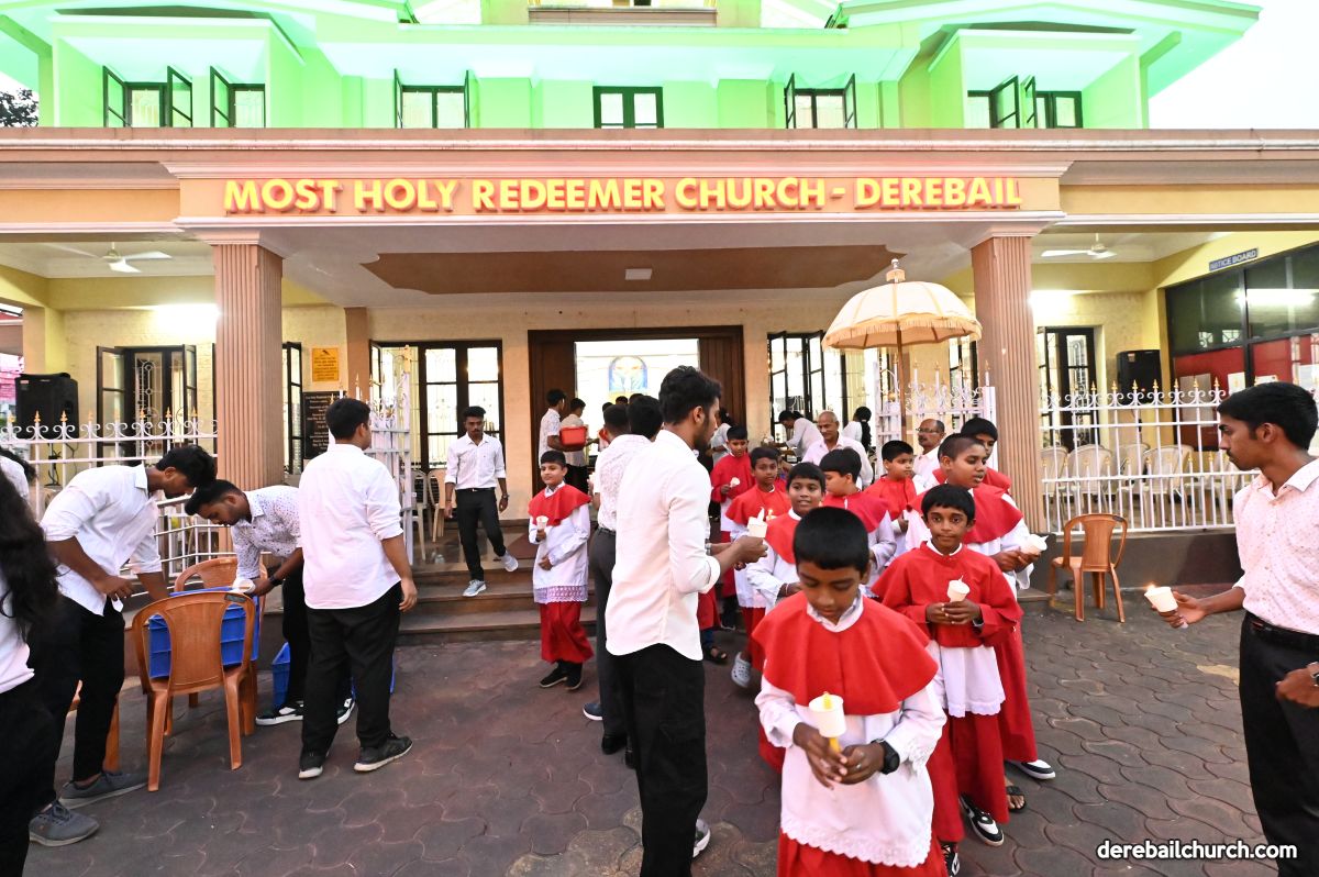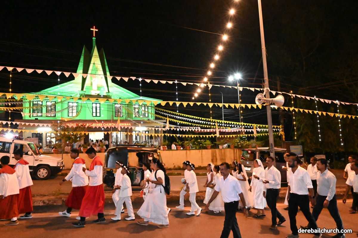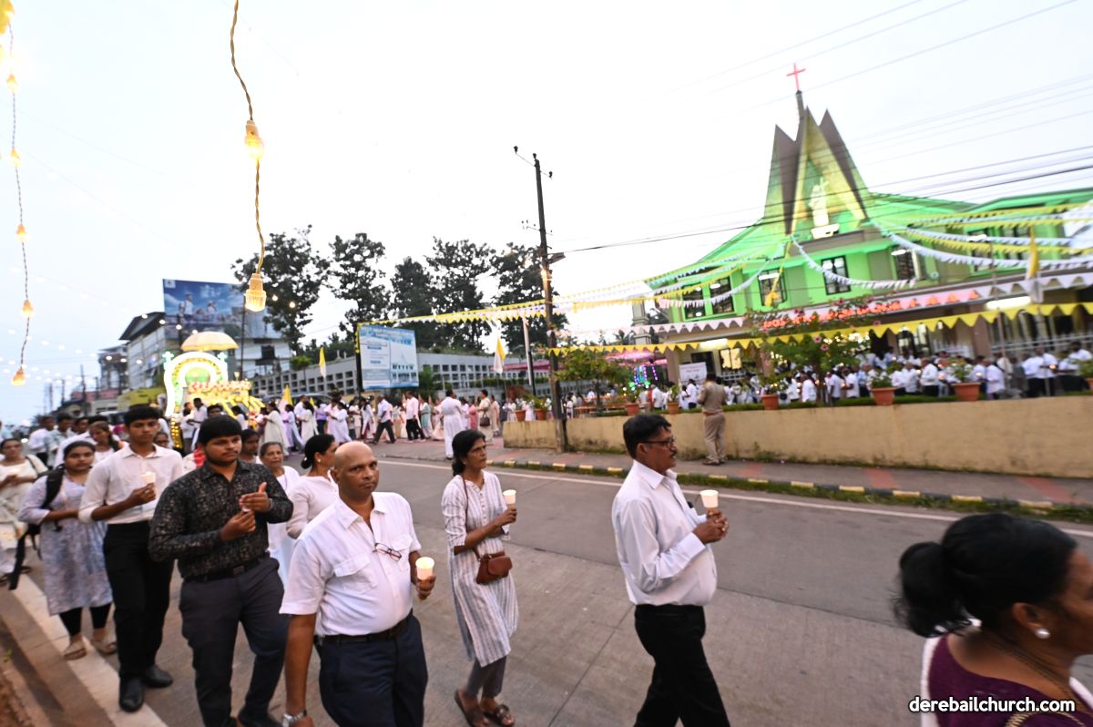 Following the Mass, a solemn procession began at the church entrance, proceeded towards Konchady Katte, and returned. Parishioners, dressed in white and off-white, participated with candles and hymns, symbolizing unity. The evening concluded with adoration of the Blessed Sacrament, accompanied by beautiful hymns by the church choir.