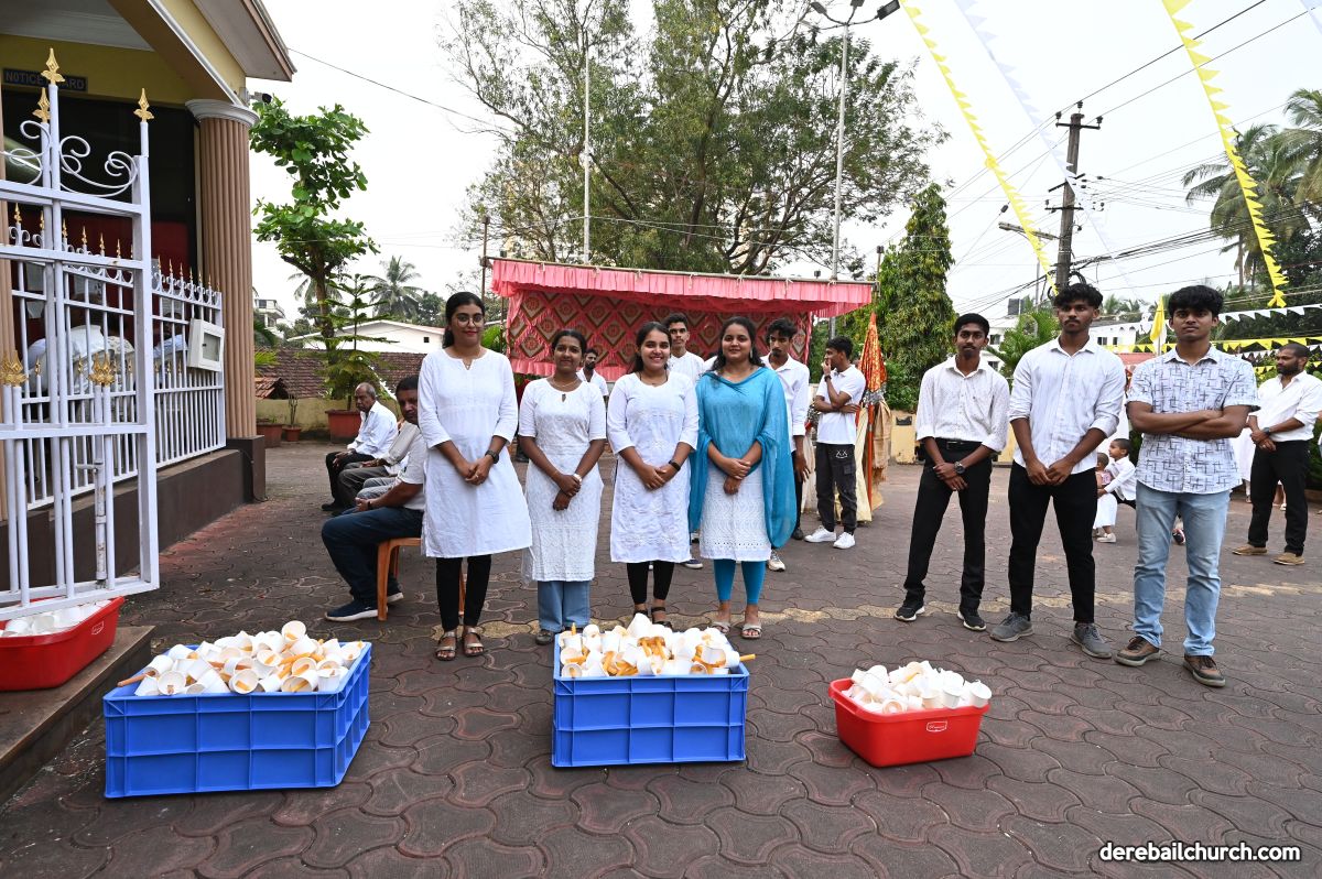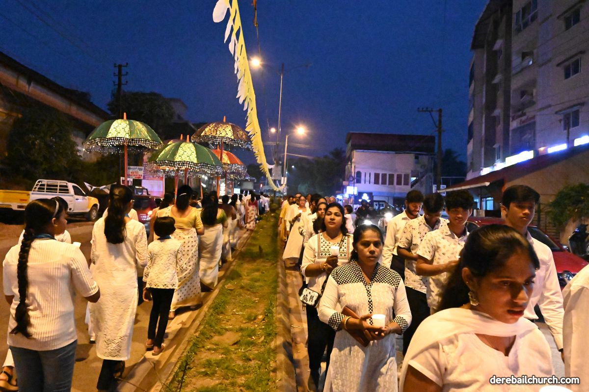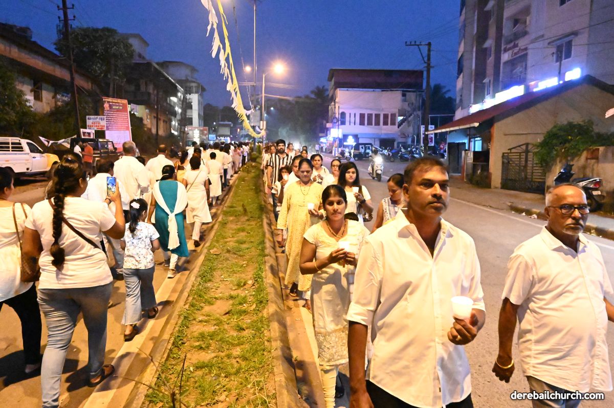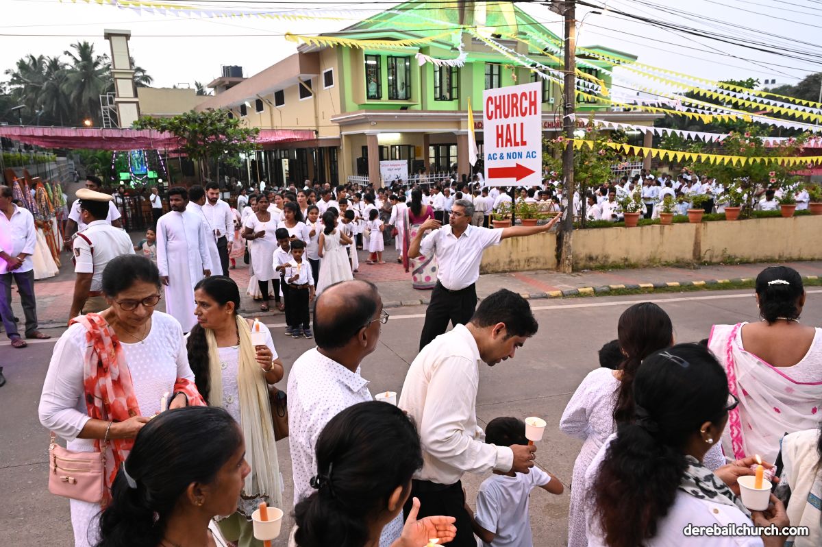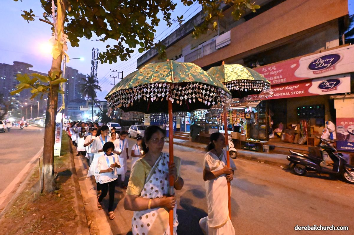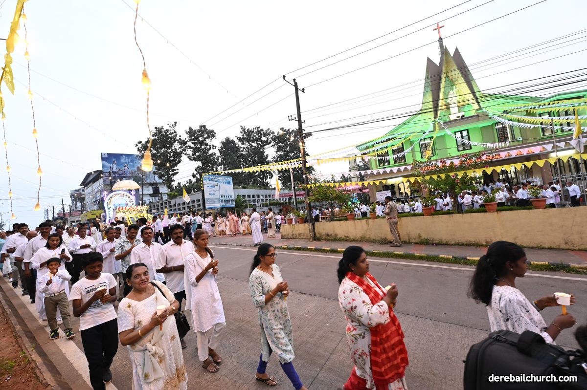 In his closing remarks, Rev. Fr. Joseph Martis thanked Rev. Fr. Denis D'Sa, the parishioners, parish associations, and the youth of Derebail for their enthusiastic participation. The Kannada commentary during the procession was provided Ms. Monti Andrade