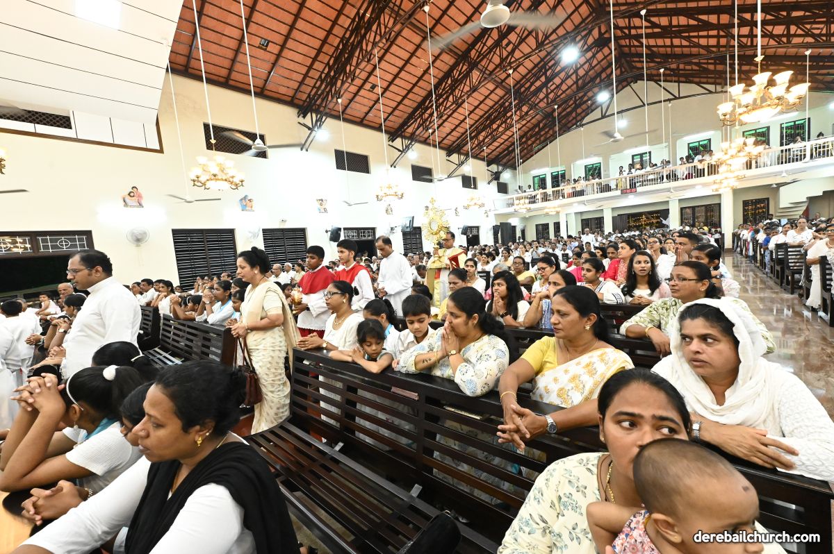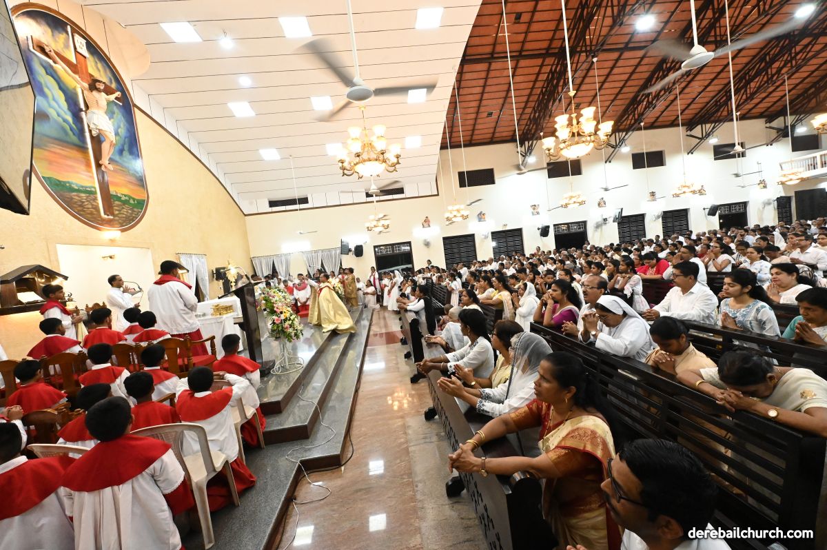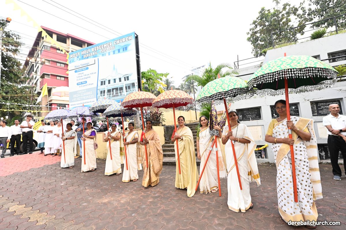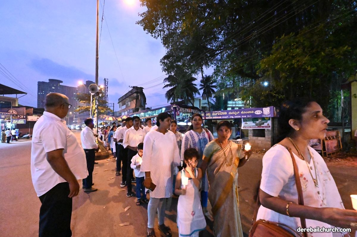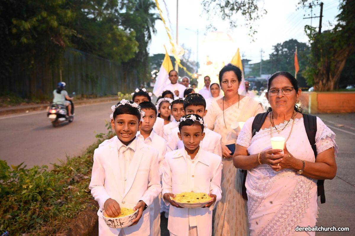 In his closing remarks, Rev. Fr. Joseph Martis thanked Rev. Fr. Denis D'Sa, the parishioners, parish associations, and the youth of Derebail for their enthusiastic participation. The Kannada commentary during the procession was provided Ms. Monti Andrade