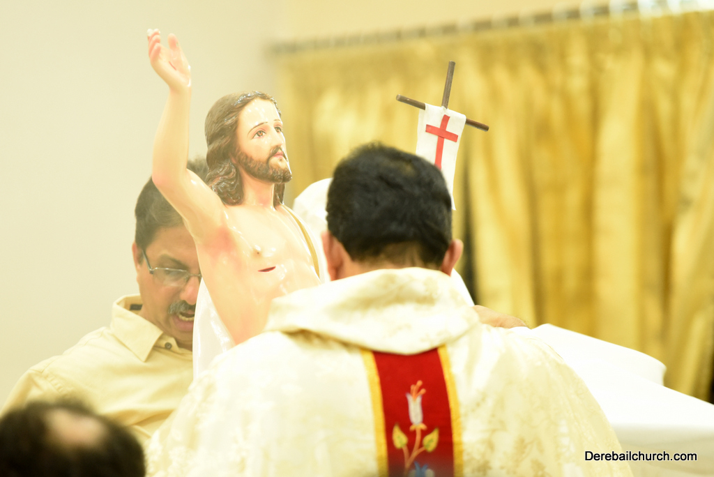 The Service of light where Jesus Christ is the light of the world,a light that no darkness can extinguish. The Liturgy of the word. The homily was given by Fr. Austin where in he said How to live a resurrected life.Those who believe in Jesus will be resurrected. The Liturgy of Baptism with Christ initiation and The Renewal of Baptismal Promises.  Finally The Liturgy of Eucharist where the Parishioners as a family join in the body and blood of christ. The mass ended with Fr. Austin wishing all the Parishioners a happy and glorious Easter.
