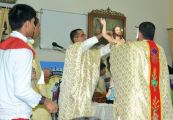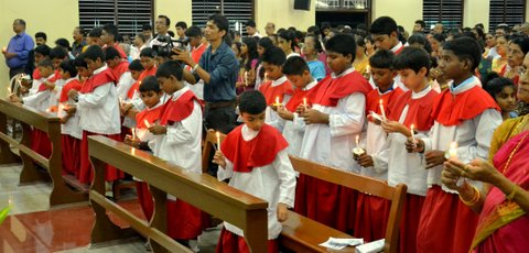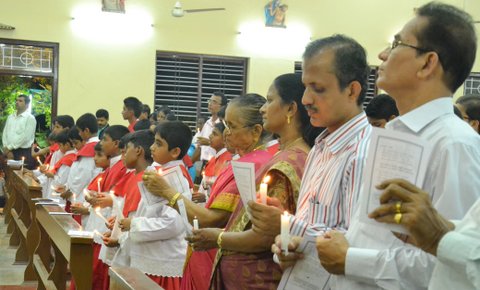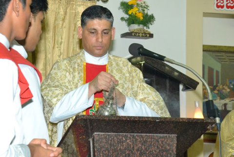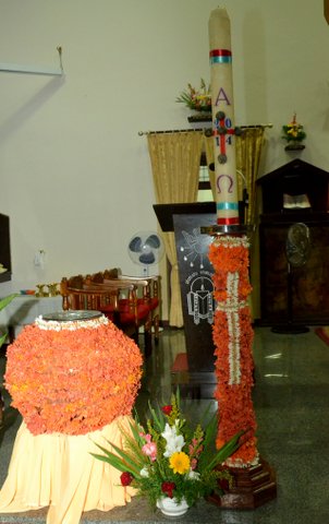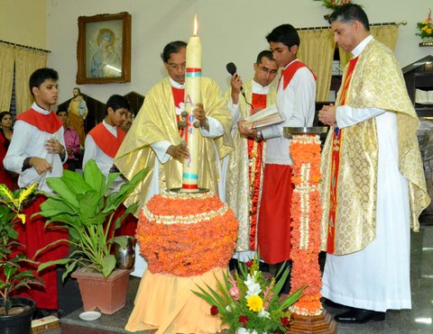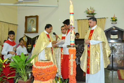 The Main Celebrant was Fr. Joseph Lobo who in his homily righty summarized the significance of the Easter night vigil by saying that the Pascal candle was lit from a few lit charcoal pieces and from it all the faithful in the church had all their candles lit up, thus lighting up the whole Church. So too, we as Christians should take forward the message of love and peace to the whole world. Speaking further he said that the water blessed today will be taken to our homes and kept in a prominent place, also used for events during the year.  In the same way the message of Christ must be spread to all in our homes and parish.