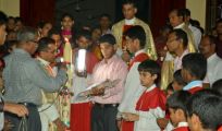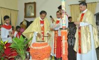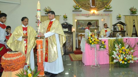 The Parish Priest Rev. Fr. Peter D’souza, Assistant Parish Priest Rev. Fr. Edwin Monis and Rev. Fr. Joseph Lobo, Director, St. Joseph’s Engineering College, Vamanjoor led the celebration of the solemn mass.  The parishioner’s lit candles signifying the victory of light over darkness and thereby enlightenment. Chanting of psalms and scriptures resonated in the air. The two and half hour long service was full of devotion with the entire congregation taking part in it. The candlelight ceremonies included the blessing of the Pascal Candle and fire by Fr Edwin Monis and blessing of the Holy water by Fr.  Peter D’souza.