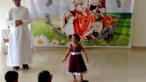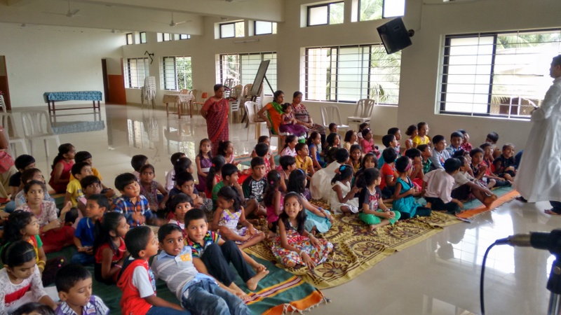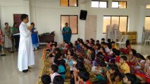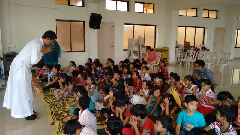 Thereafter Fr. Anil Lobo interacted with kids teaching the values of love. Then he narrated the parable of “The prodigal son” and the YSD volunteers enacted the same. The room was filled with laughter when there was an entry of a pig. The Kids thoroughly enjoyed the skit. The kids were then entertained by action songs “God’s Love it’s so wonderful”, “Davidne Goliyath ko Gopan se mara” “TringTring Cycle Gadi”. The programme concluded with the hymn “There shall be showers of blessings” while Fr. Anil blessed each and every kid present.