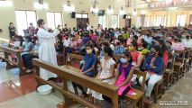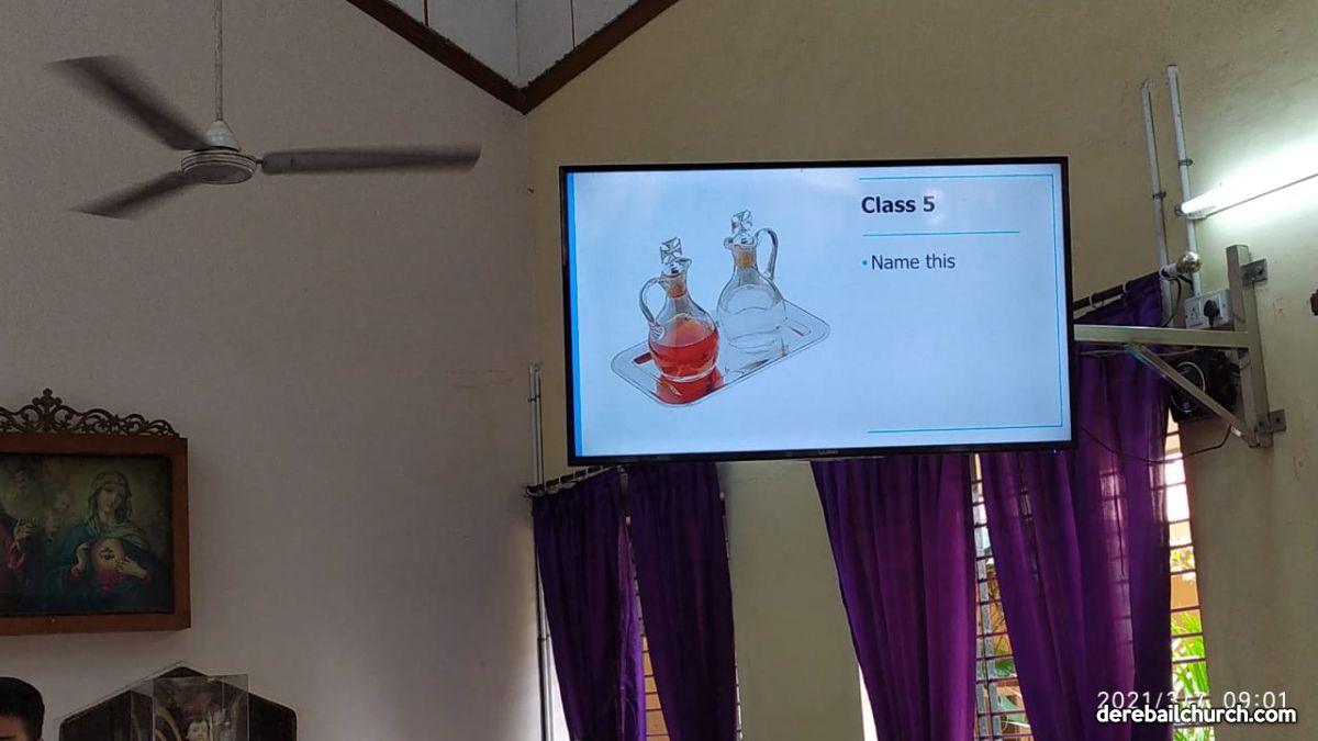 There were three rounds. Various liturgical items and vestments were displayed on and offscreen. The task was to identify and name the items displayed. Class wise questions were asked to the children. Active participation was observed among all the batches. At the end of third round audience were asked few questions.