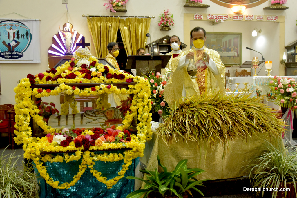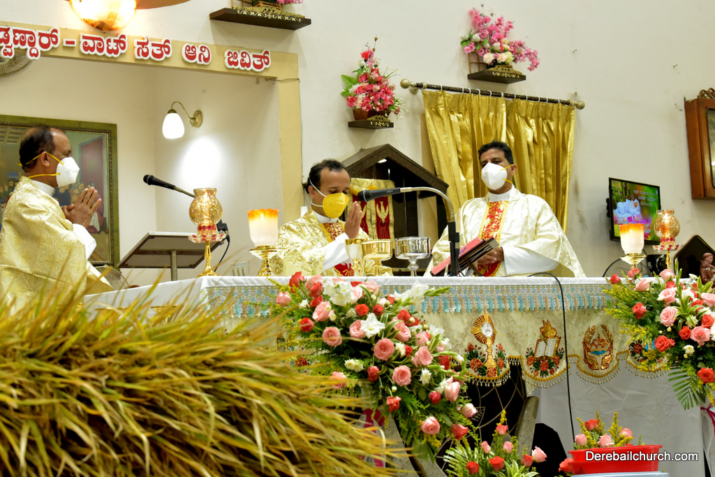 The Nativity Celebration at Most Holy Redeemer Church Derebail commenced at 7 AM with a solemn mass. Rev. Fr. Gratian Alvares, Resident Priest concelebrated the mass with the Parish Priest Rev. Fr. Austin Peres, Resident Priest Rev. Fr. Gerald Pinto and Rev. Fr. Walter Pinto. In his Homily, Fr. Gratian stressed the importance of family and called everyone to be thankful for the gift of family. He emphasized the need to show love and care towards mother nature for her bountiful harvest. He concluded asking everyone to look upon Mother Mary as an inspiration and live a life that pleases God.