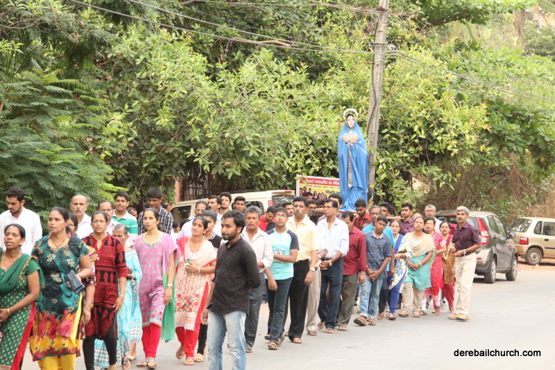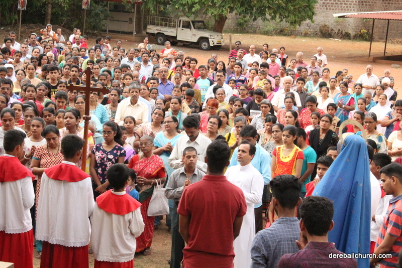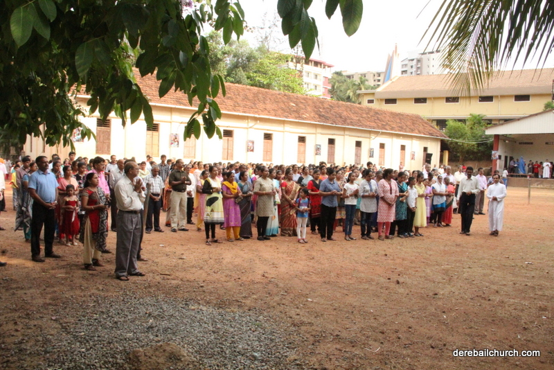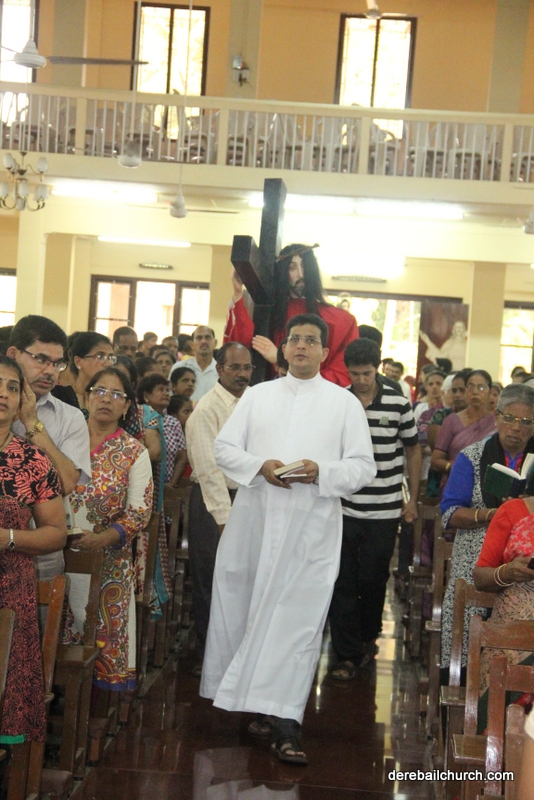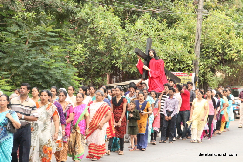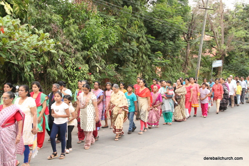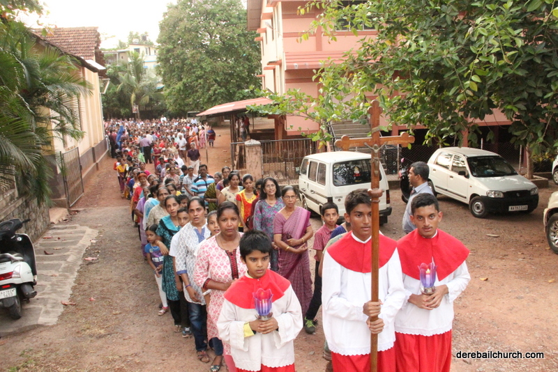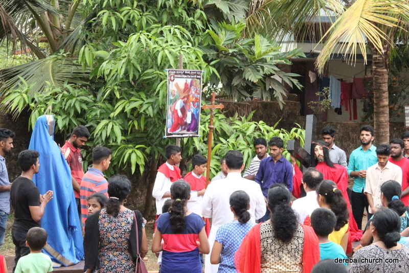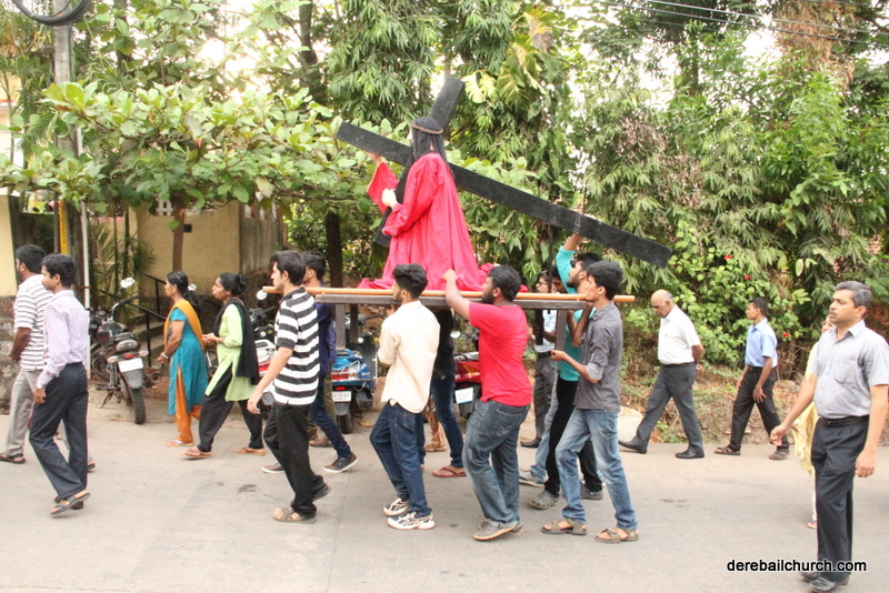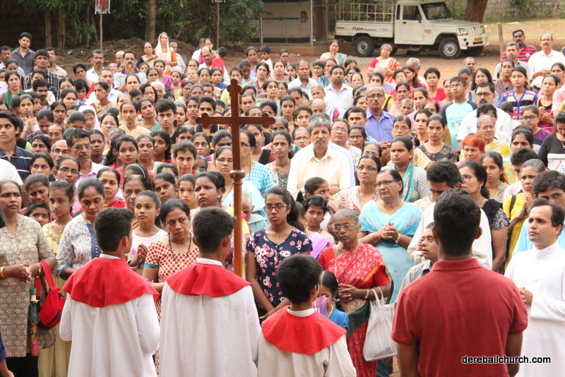 On Palm Sunday the glorious entry of Jesus into Jerusalem is celebrated in churches all over the world. As a part of the service of the Palm Sunday, a Way of the Cross was conducted in the Holy Family School Grounds, Derebail at 5 in the evening. The Parish Choir carried out the Way of the Cross with great solemnity. After the Way of the Cross the parishioners proceeded to the church where a homily was delivered by Fr.Gratian Alvares. The evening was spent in veneration of Jesus and Mother Mary.