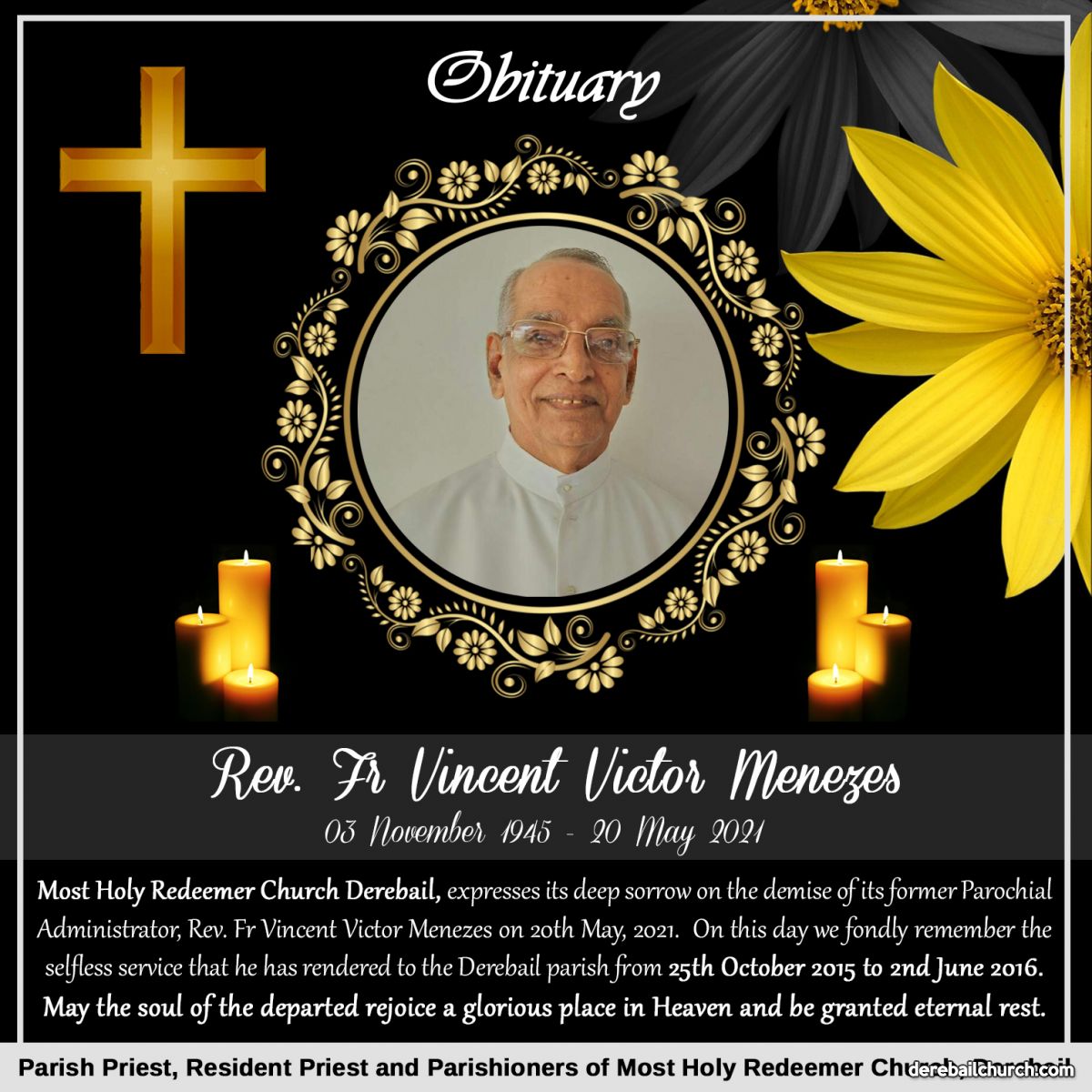 Most Holy Redeemer Church Derebail, expresses its deep sorrow on the demise of its former Parochial Administrator, Rev.Fr.Vincent Menezes on 20th May, 2021.  On this day we fondly remember the selfless service that he has rendered to the parish from October 2015 to June 2016.