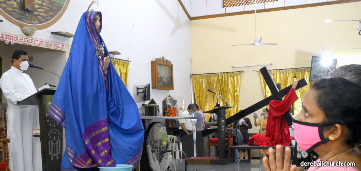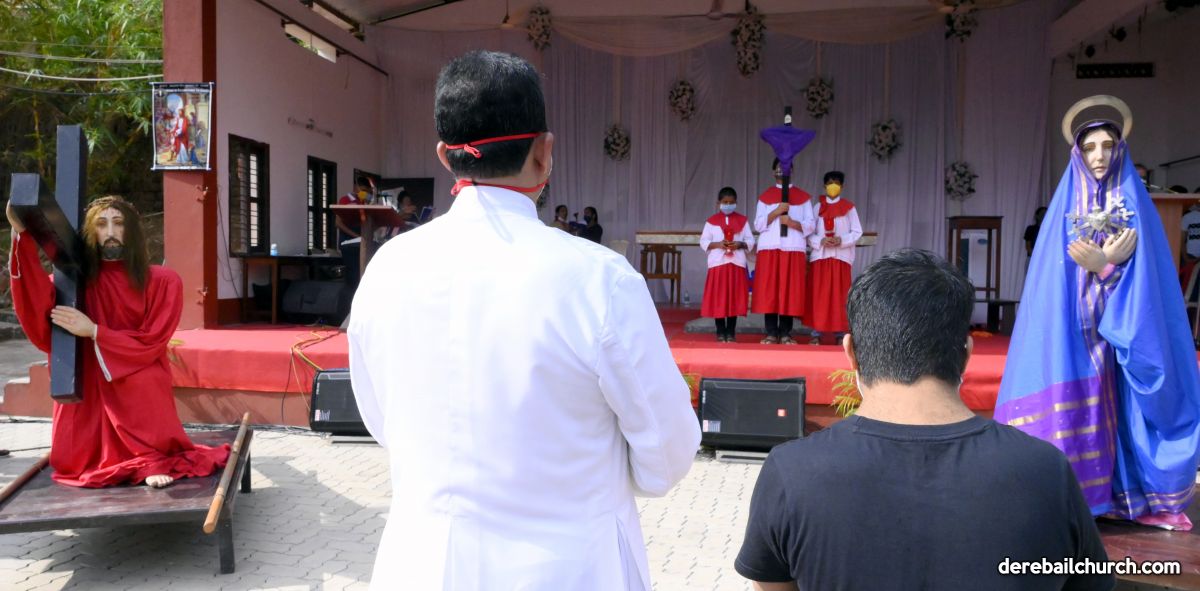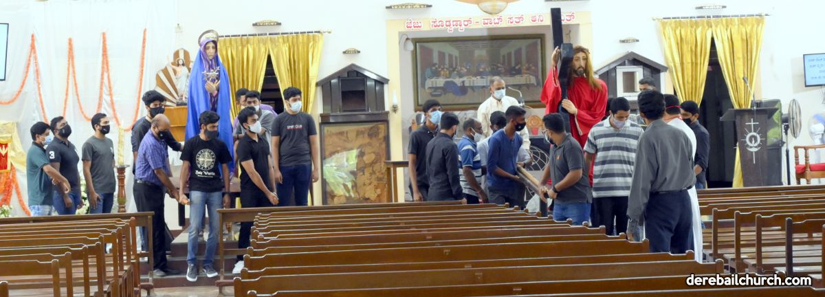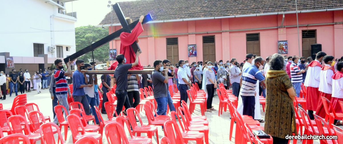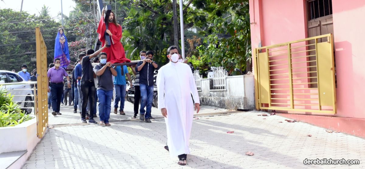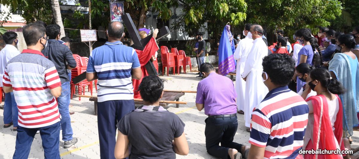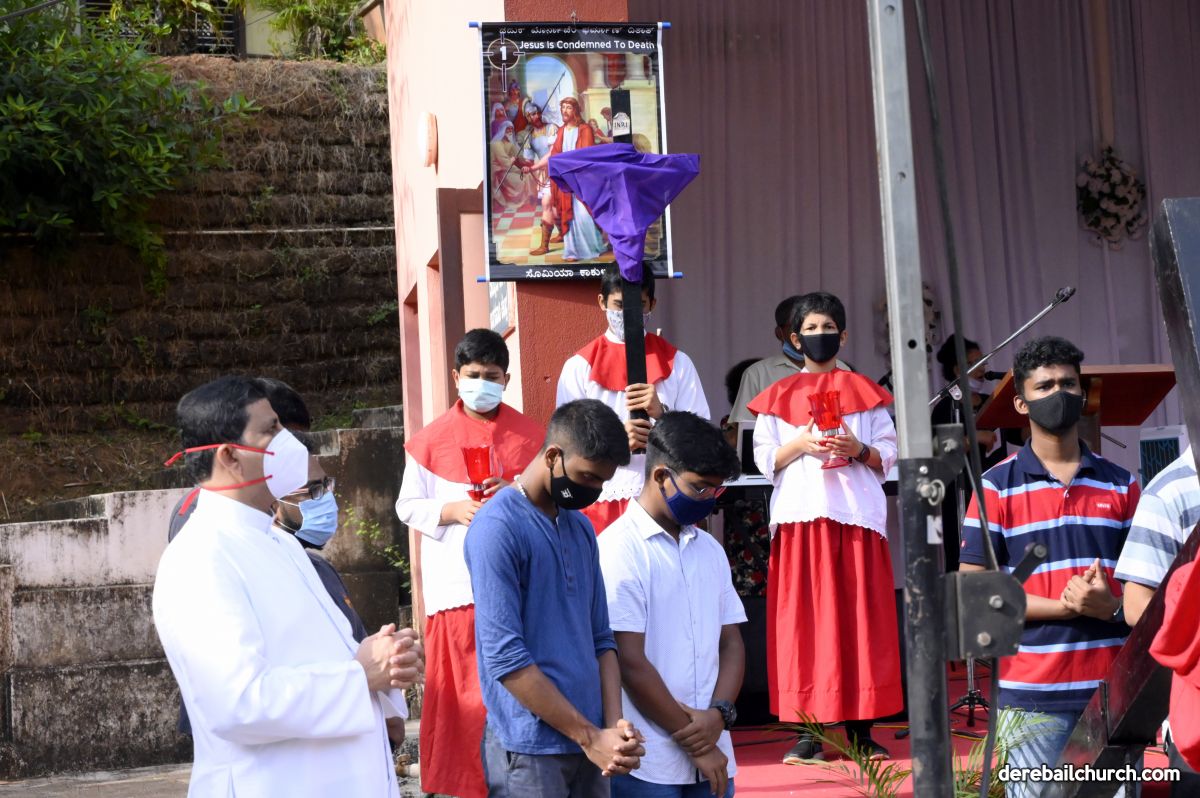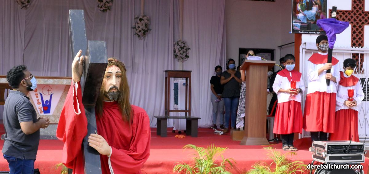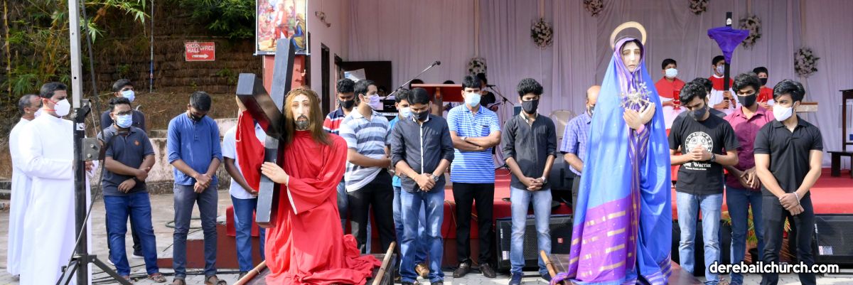 The Good Friday service at Most Holy Redeemer Church Derebail began at 8 AM with a prayer service. Rev. Fr. Austin Peres led the service where the devotees sang in unison Psalms and recited prayers. This was followed by the Way of the Cross at the Holy Family School Grounds. The Youth of the parish led the Way of the Cross. The parishioners took part in the commemoration of the Passion of Jesus with great devotion.